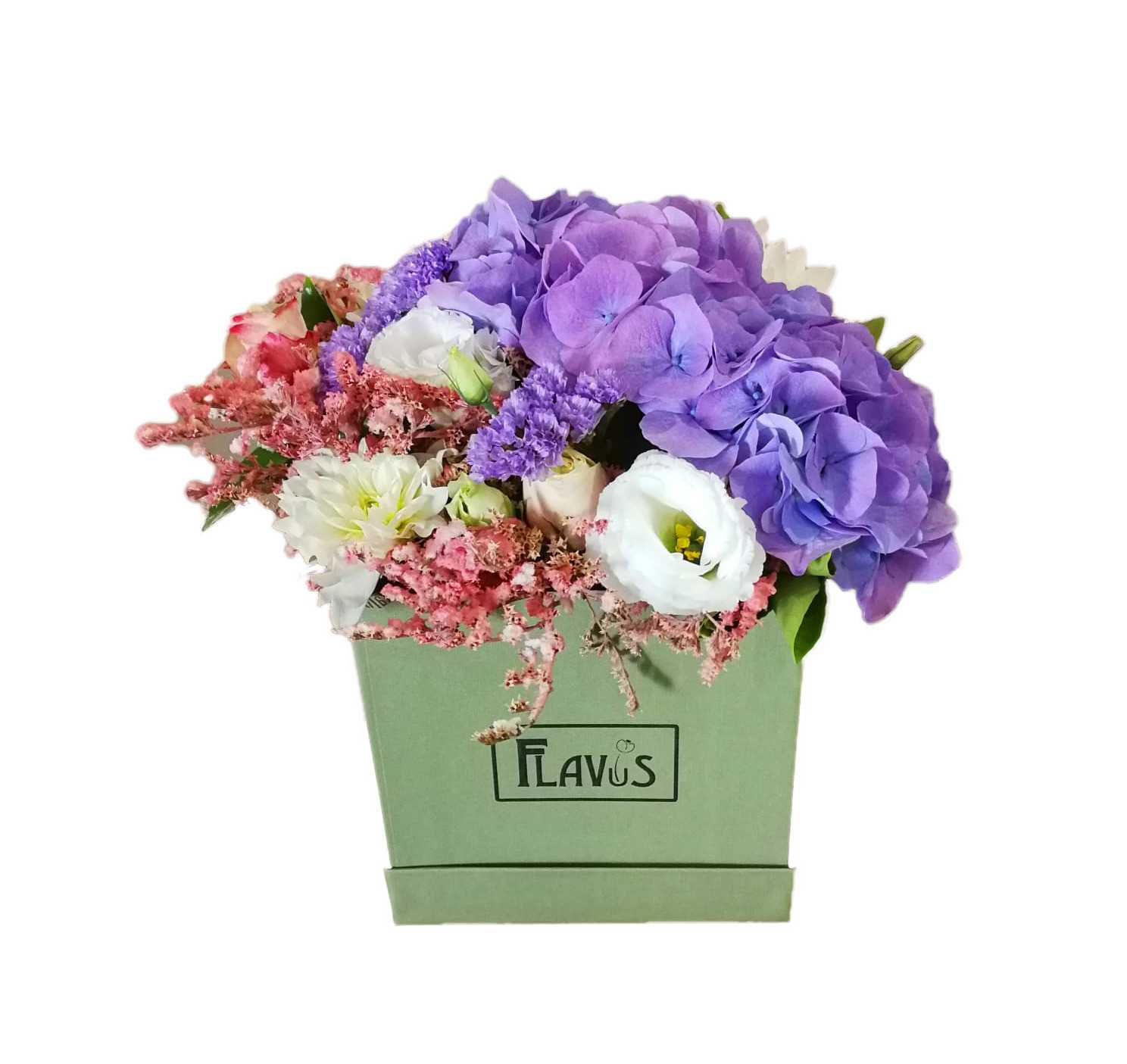 Scatola quadrata grande con lisianthus,rose,dalie e ortensia.Lavorata in cartone con riserva d'acqua in maniera tale da conservarne la resistenza per diversi giorni. Acquisto con ritiro in negozio.