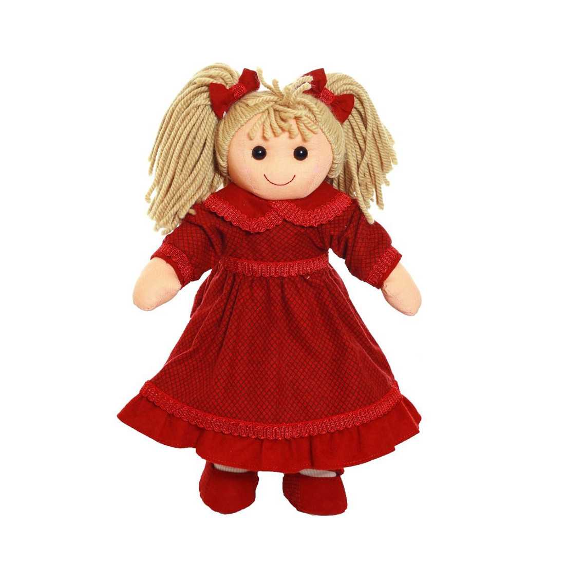 Bambola con due ciuffi biondi e due fiocchi rosso. Il vestito, interamente di color rosso, è composto da due stoffe una a tinta unita e una a quadretti, è poi contornato da trine che sono state cucite sul colletto, sulle maniche, sulla vita e sulla gonna.