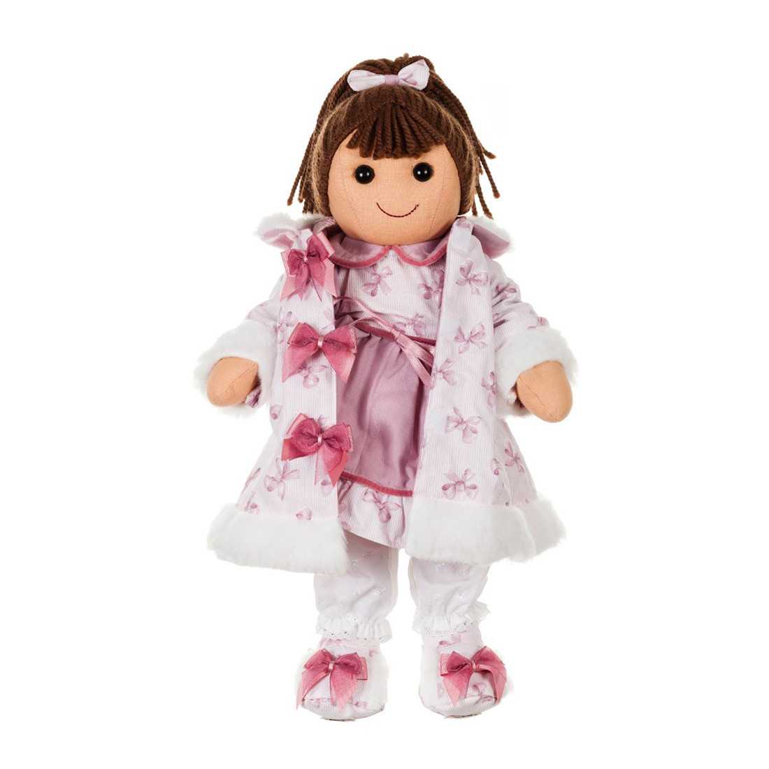 Bambola con un ciuffo moro legato da un laccio per capelli decorato con un fiocco rosa.