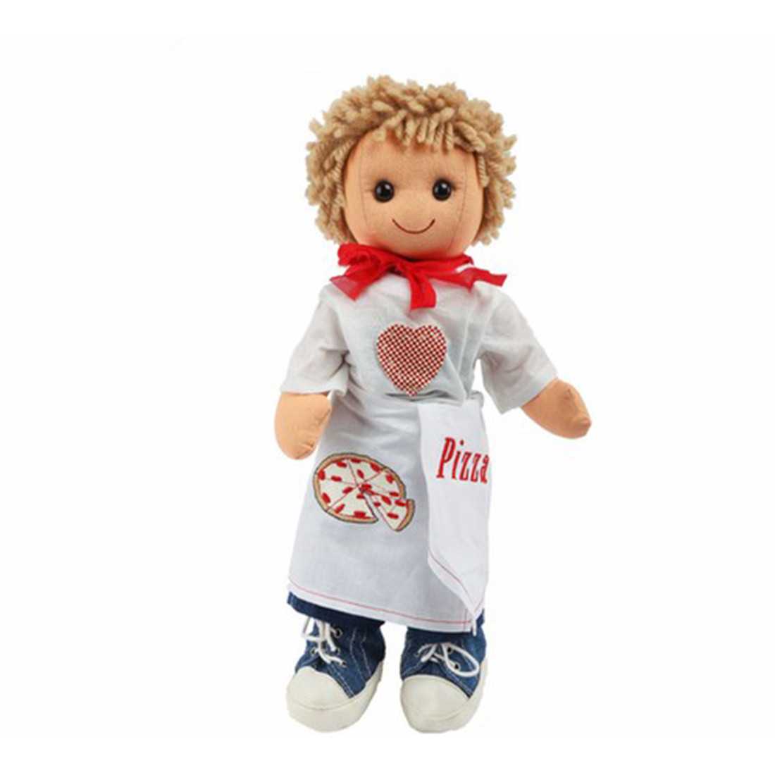 Bambolo biondo con un foulard rosso, maglia bianca con un cuore a quadretti bianchi e rossi applicato al centro della maglia, pantaloni e scarpe di jeans, grembiule bianco con il ricamo di una pizza margherita e un cencio con il ricamo "Pizza".