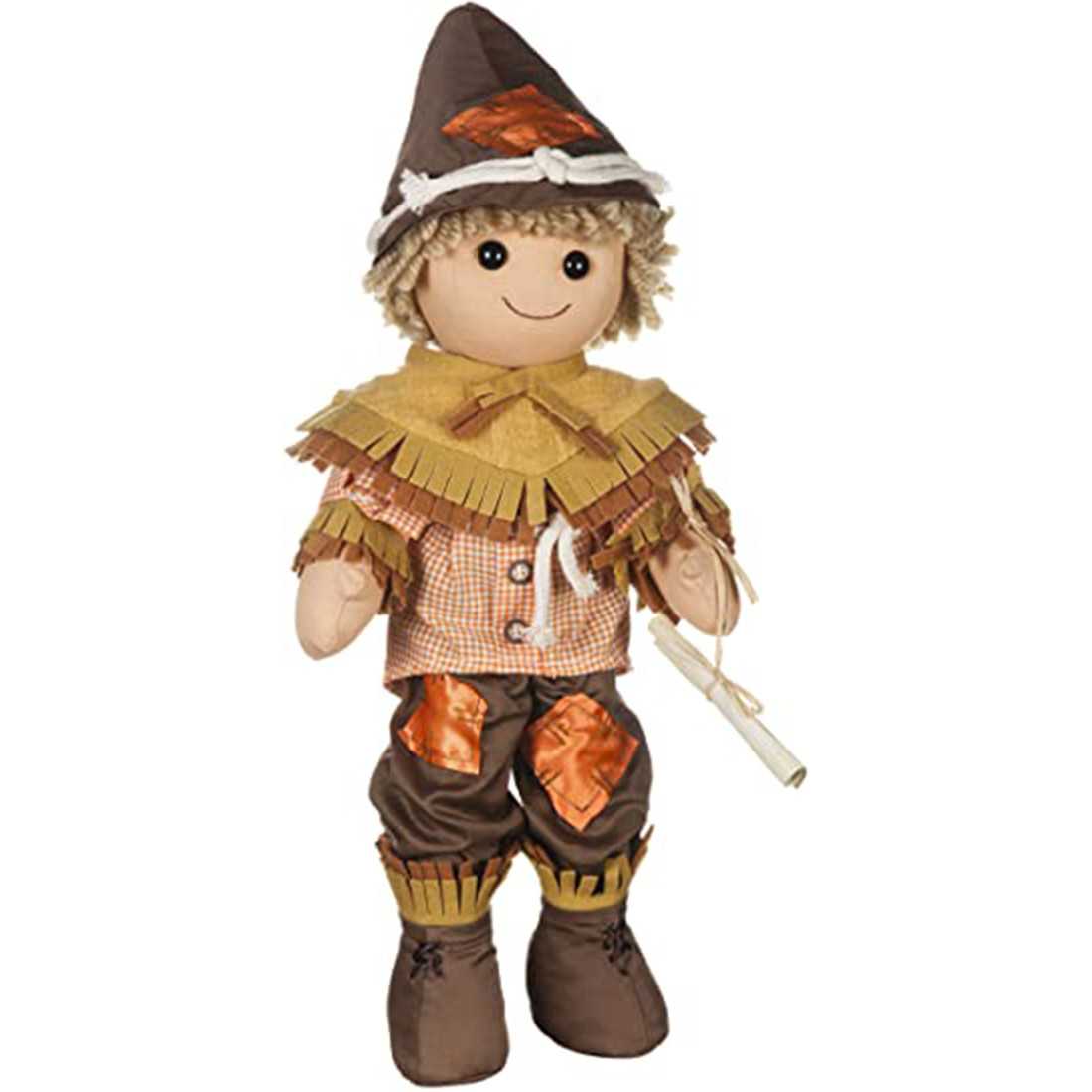 Bambolo biondo con un cappello a punta marrone circondato da una corda bianca e una toppa arancione cucita sopra. La maglia a scacchi arancione, i pantaloni marroni con una toppa e le scarpe sono circondate da panno marrone/giallo a forma di paglia.