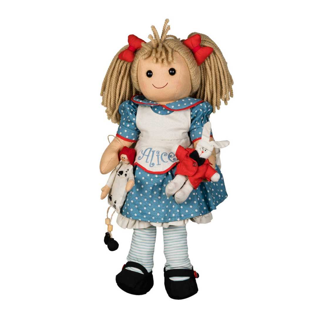 Bambla con due ciuffi biondi legati con due fiocchetti rossi. Sopra al vestito blu a pois bianchi è stato posto un grembiule bianco sul quale viene ricamata la scritta “Alice” in azzurro. Legati alle mani della bambola ci sono una carta e il coniglio bianco.