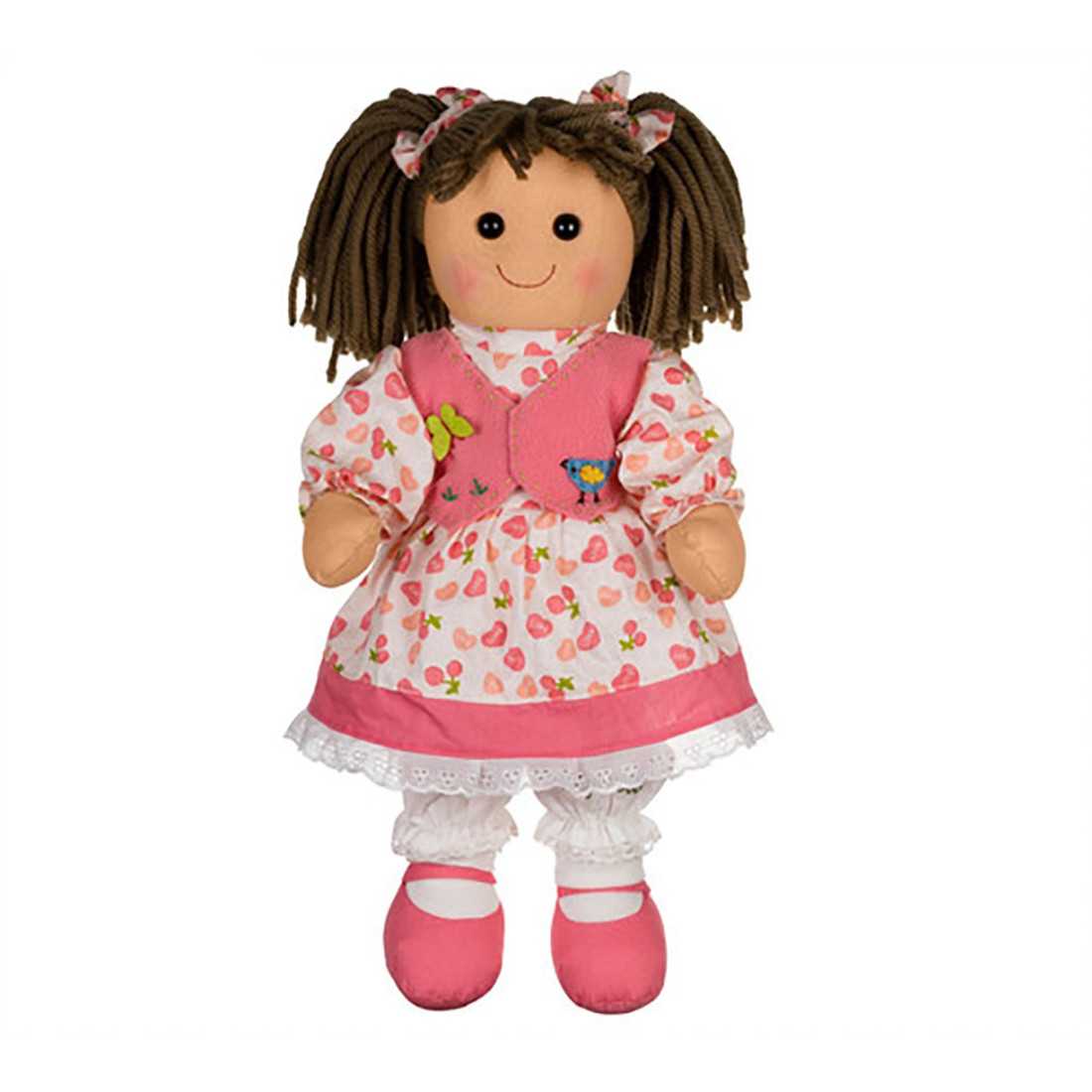 Bambola con due ciuffi mori e due fiocchetti. Il vestito bianco con fiori e cuori rosa è abbinato ad un gilet rosa con delle applicazioni colorate di un uccellino e una farfalla. Le scarpe non sono rimovibili.