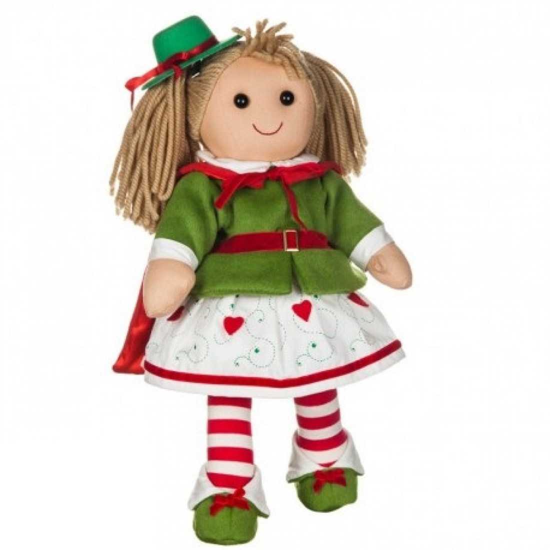 Bambola con due ciuffi biondi e un cappello verde decorato con una striscia di raso rossa. La fantasia e i colori del cappello vengono riprese su tutto il vestito: la giacca verde con cintura rossa, il vestito con ricami verdi e cuoricini rossi sulla gonna, le calze a strisce bianche e rosse e il mantello rosso.