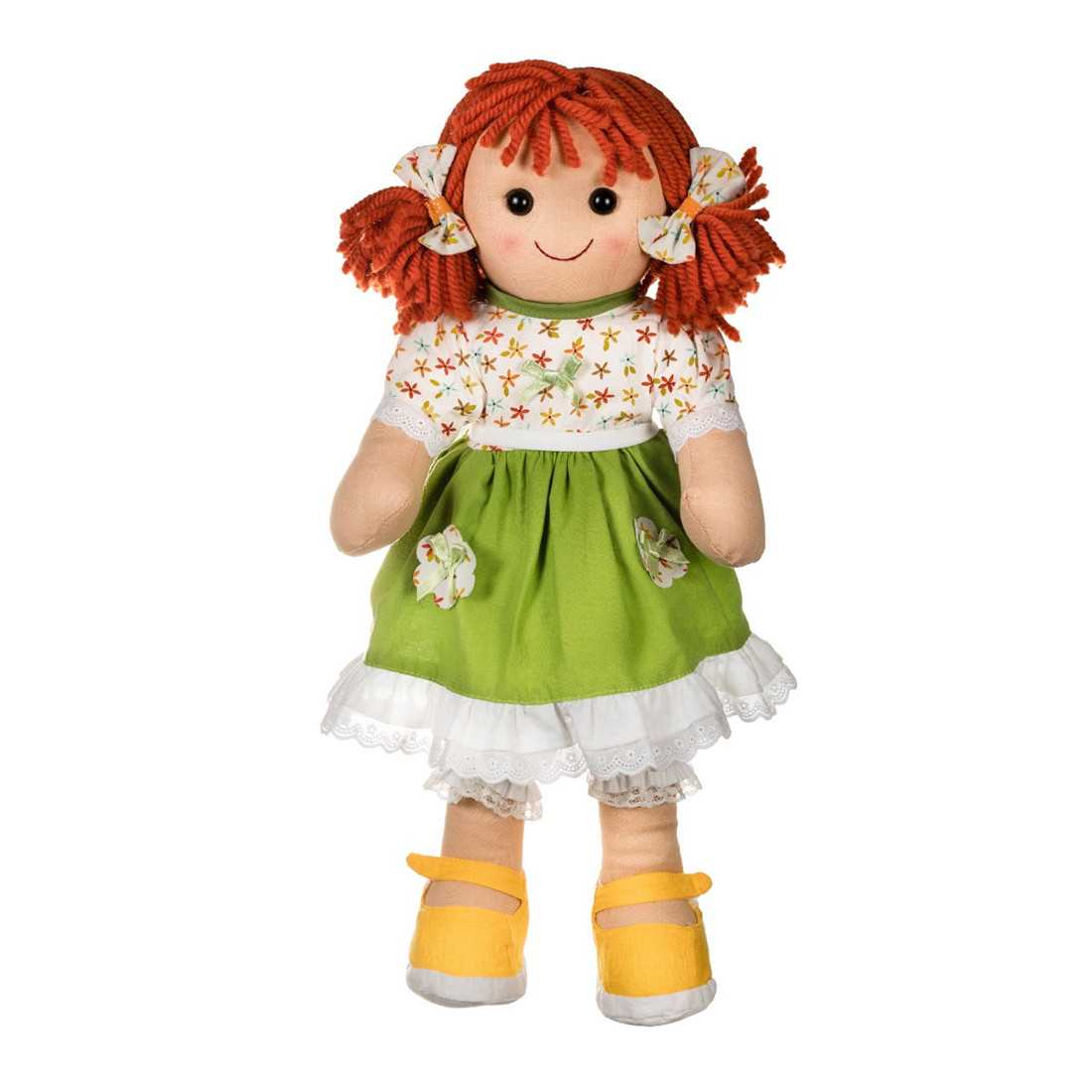 Bambola con due codine rosse legate da due fiocchetti bianchi con fantasia floreale. Il vestito, bianco con fantasia floreale, ha una gonna di color verde a tinta unita sulla quale sono stati cuciti due fiorellini bianchi con un fiocchetto verde al centro.