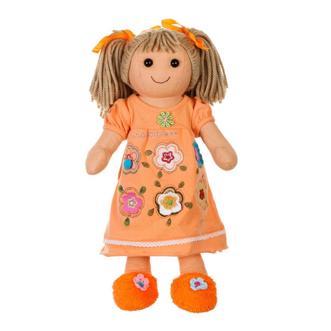 Bambola con due ciuffi legati con il nastro arancione. La camicia da notte è decorata da fiori disegnati e cuciti all'uncinetto e la scritta ''C'era una volta...My Doll''. Ai piedi sono poste due ciabattine in spugna, anch'esse con applicazione di fiori.