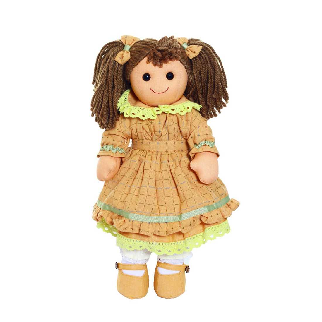 Bambola con due ciuffi mori e due fiocchetti gialli con fantasia geometrica. Il vestito, anch’esso giallo con fantasia, è contornato da trine gialle sul colletto e sul fondo della gonna e bordature verdi su maniche e gonna.