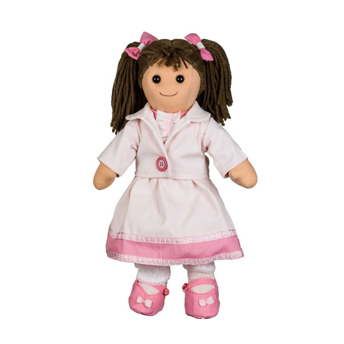 Bambola co due ciuffi mori legati da due fiocchi rosa. Tutto il completo è di color rosa a partire dal vestito con le trine di to alita più scusa, la giacca con un bottone decorato con un disegno sempre diverso e le scarpe con un fiocco.