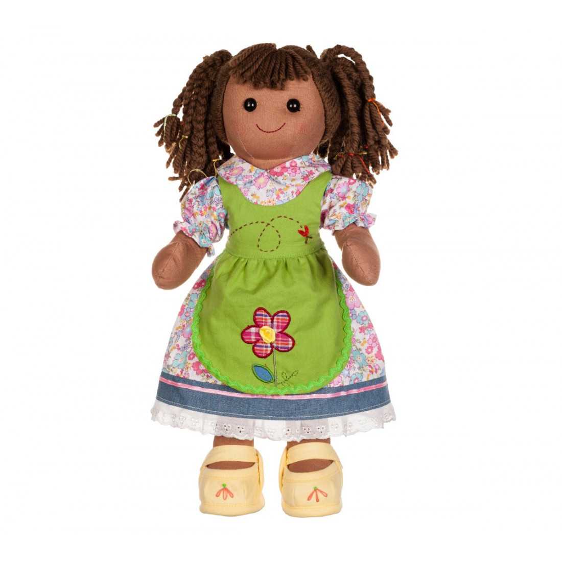 Bambola mulatta con tante treccine legate da fili colorati. Il vestito bianco con fantasia floreale ha una striscia di jeans cucita sul fondo dalla gonna; sopra di esso è stato posto un grembiule verde contornato da trine e il ricamo di un fiore e una coccinella rossa.