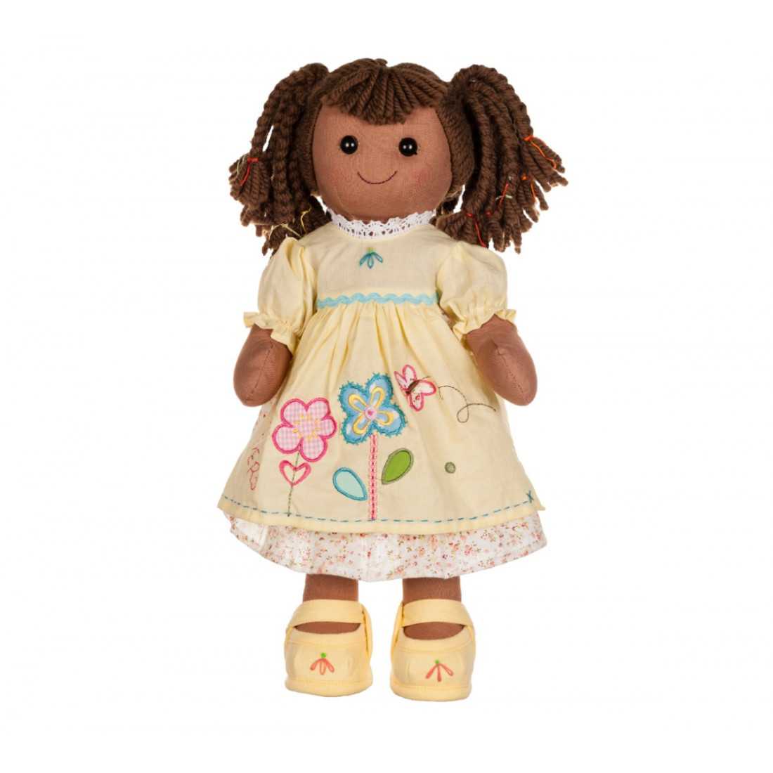 Bambola mulatta con tante treccine legate da fili colorati. Sopra la sottoveste bianca con fantasia floreale è posto il vestito giallo, il quale è decorato con il ricamo di fiori, farfalle e la scritta “Flower” (“Fiore”).