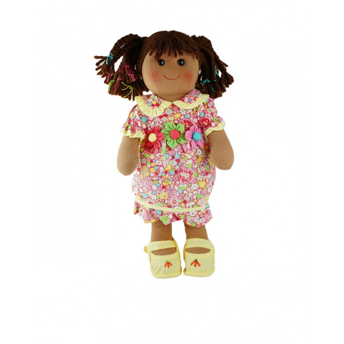 Bambola My Doll- Tonya capelli mori con treccine. Vestito di color rosa con fantasia floreale, bordature gialle e tre fiori cuciti sulla vita di diverso colore per ogni vestito. Scarpe: Gialle con un disegno a forma di fiore. Rimovibili