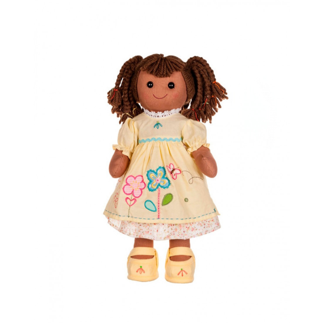 Bambola My Doll- Pam Capelli mori con treccine. Vestito giallo decorato con trine e ricami di fiori, farfalle e la scritta "Flowers" (="Fiori") con sottoveste bianca fantasia floreale. Scarpe: Gialle con il ricamo di un fiore rosso. Rimovibili.