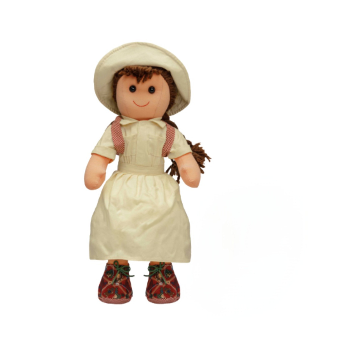 Bambola My Doll- Esploratrice capelli mori con treccia.Vestito maglia con colletto e due taschine color sabbia/ gonna tipo palloncino color sabbia.