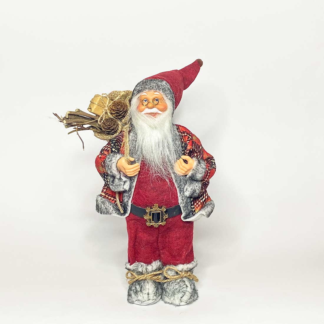 Grazioso Babbo Natale ideale per creare la giusta atmosfera natalizia. Questo dolce addobbo porta in spalla un sacco di doni, indossa un particolare vestito rosso in velluto con dettagli scozzesi.