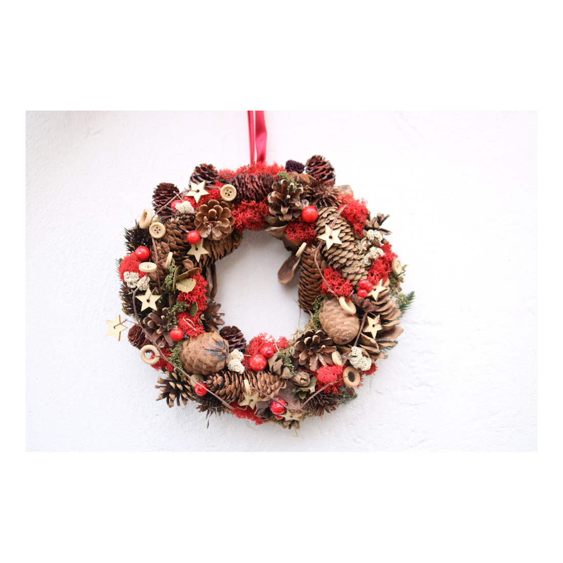 Arricchita con decorazioni fatte di bacche rosse, pigne naturali, muschio stabilizzato e piccoli dettagli in legno.